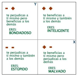 Se lo comenté a un colega que también está al margen de la guerra y fuimos colocando a cada uno de nuestros compañeros en el cuadrante adecuado. Nos quedamos un poco preocupados porque se nos apelotonaban en la parte de los Malvados. Por nuestra parte estábamos situados en la casilla de los bondadosos. Vimos claramente el peligro que corríamos al estar doblemente perjudicados: por nosotros mismos y por los malvados.