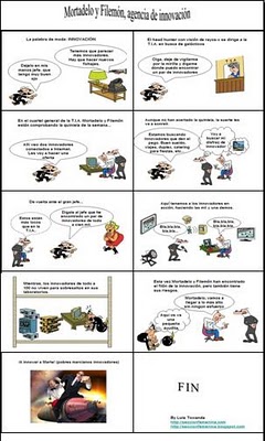 Lula: En mi caso, que no soy innovador sino más bien neoclásico y jamás he ganado 1€ (esas monedas que valen 166 pesetas), te puedo asegurar que en todo lo que he intentado (Asociaciones pioneras, Galas, espectáculos, artículos periodísticos, Portavocías comprometidas, colaboración para nuevas leyes en la Universidad y un nuevo Trabajo) los demás han salido ganando y yo, casi siempre, perdiendo. Así que hace mucho que tiré la toalla, en el año de la Igualdad de Oportunidades (Plan 2007-2011), éste 2008 del Diálogo Intecultural, y también de la Juventud Iberoamericana, para innovar y que Nada Cambie. Está ya casi todo escrito.Pero si la innovación es el cambio al €uro, los pisos de 20 metros, el teléfono del maltrato, los 400 €, el cambio climático, la subida del IPC, de la luz, la gasolina, los alimentos, las miembras, el candelabro, el dixit y el pixit, la política linguística y tal, metiendo millones de €uros a la Saca del despilfarro, que innoven por donde les quepa, aunque me recuerda al 92. Sinceratly. Ya sabes como funciona esto. Da asco.El terror, la ineficacia, la incompetencia y la traición, son otras armas de la No-Innovación, claro. Tu post me ha recordado a The Body Snatchers, pero no te conviertas en un@ de ell@s aunque te digan que pueden hacer llegar a Marte, la Vida.Un abrazoFeliz VeranoPd: Dicen que el primer animal que canta por la mañana es el Gallo.